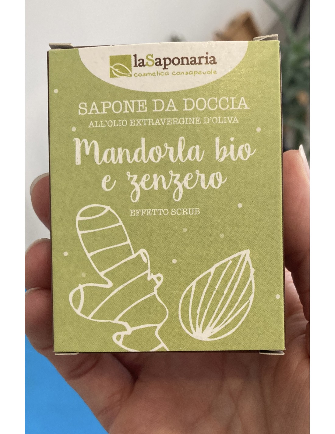 Il BIO SAPONE DA DOCCIA ALL'OLIO EXTRA VERGINE DI OLIVA MANDORLA E ZENZERO EFFETTO SCRUB de "La Saponaria" è fatto a mano saponificando l'olio extra vergine d'oliva biologico, l'olio di mandorle dolci e lo zenzero. L'olio extra vergine di oliva è l'ideale per trattare le pelli secche e disidratate, poiché ha una spiccata azione emolliente e contrasta la perdita d'acqua, mantenendola idratata e morbida. L'olio di mandorle dolci ha proprietà emollienti ed elasticizzanti, adatto per le pelli più aride e sensibili. Della mandorla però non si butta via nulla e grazie al suo guscio micronizzato la pelle sarà levigata e rigenerata. Lo zenzero contrasta l'invecchiamento cutaneo. Ideale per una doccia rivitalizzante, che scaccia via cattivi pensieri e non pesa sull'equilibrio del nostro pianeta.