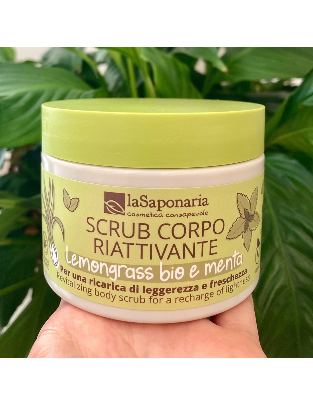 Lo Scrub Biologico ed Equosolidale LEMONGRASS E MENTA de "La Saponaria" è una sferzata di energia ed ottimismo. Grazie agli estratti di edera, gingko e rosmarino, si avvertirà una sensazione di freschezza. L'estratto di edera ed il gingko sono tonificanti ed aiutano a contrastare gli inestetismi della cellulite. Il rosmarino è antiossidante, antibatterico ed energizzante. Preparato con zucchero di canna equosolidale, polvere di mandorle e sale integrale, stimola la microcircolazione e lascia la pelle morbidissima. Gli oli essenziali di lemongrass e menta sprigionano un profumo inebriante.