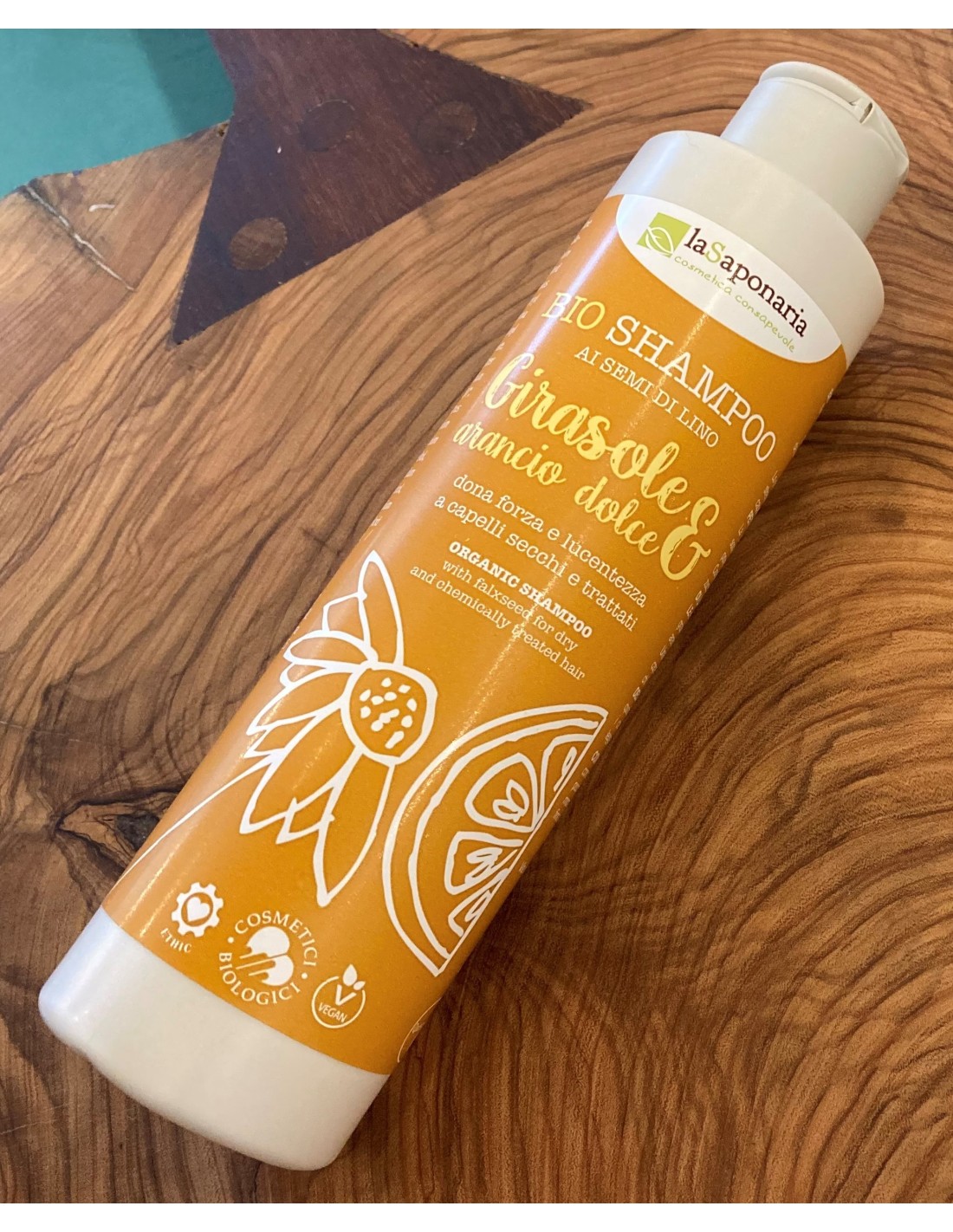Grazie al Bio Shampoo de "La Saponaria" al Girasole e all'Arancio Dolce i tuoi capelli saranno morbidi e pettinabili, grazie ai semi di lino, alla moringa, al girasole, all'arancio dolce ed al geranio. Al suo interno anche l'Aloe ha un ruolo fondamentale: nutre i capelli danneggiati, eliminando la forfora.